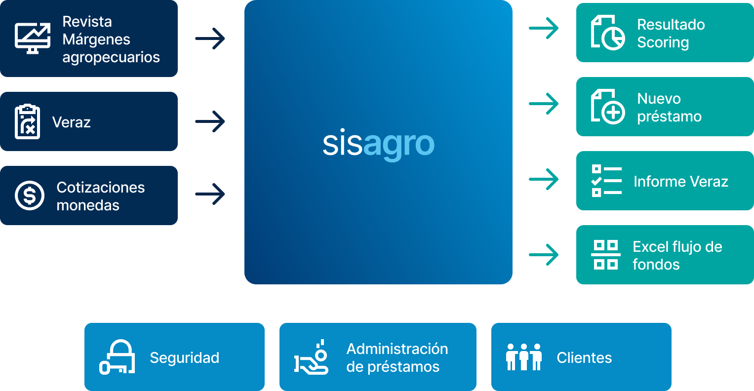 A partir de la carga de información como tamaño del campo, ubicación, tipo de producción, arrendamiento, maquinaria y datos de la campaña actual, se calcula el flujo de fondos esperado y el monto potencial de crédito. Luego, mediante consultas al sistema financiero y a VERAZ vía web service, se validan automáticamente aspectos como cheques rechazados, inhabilitaciones, concursos, quiebras, score crediticio, relación compromisos/ingresos y situación en BUREAU, para definir la aceptación o rechazo del crédito solicitado.